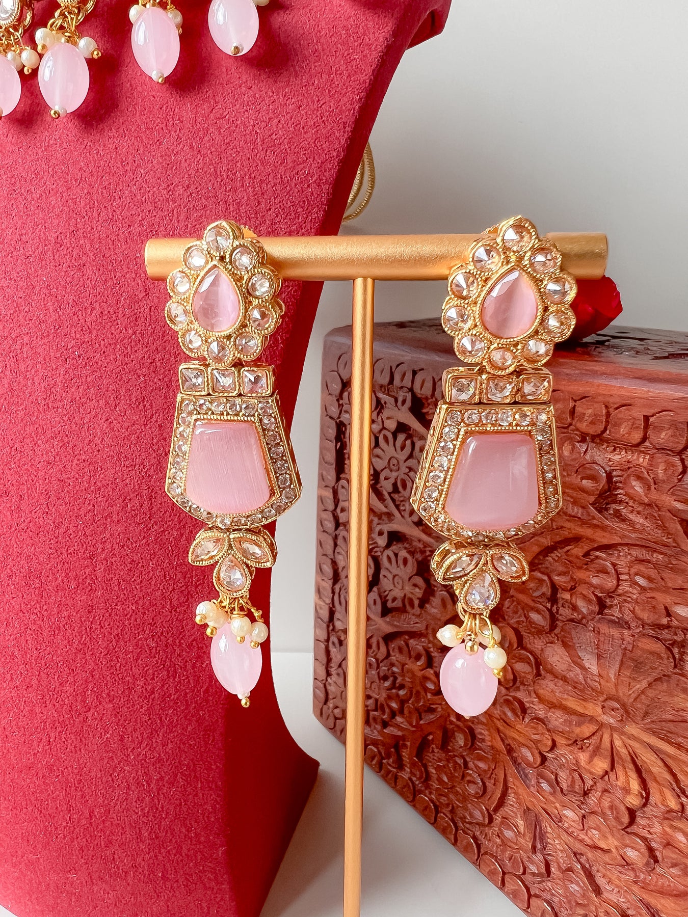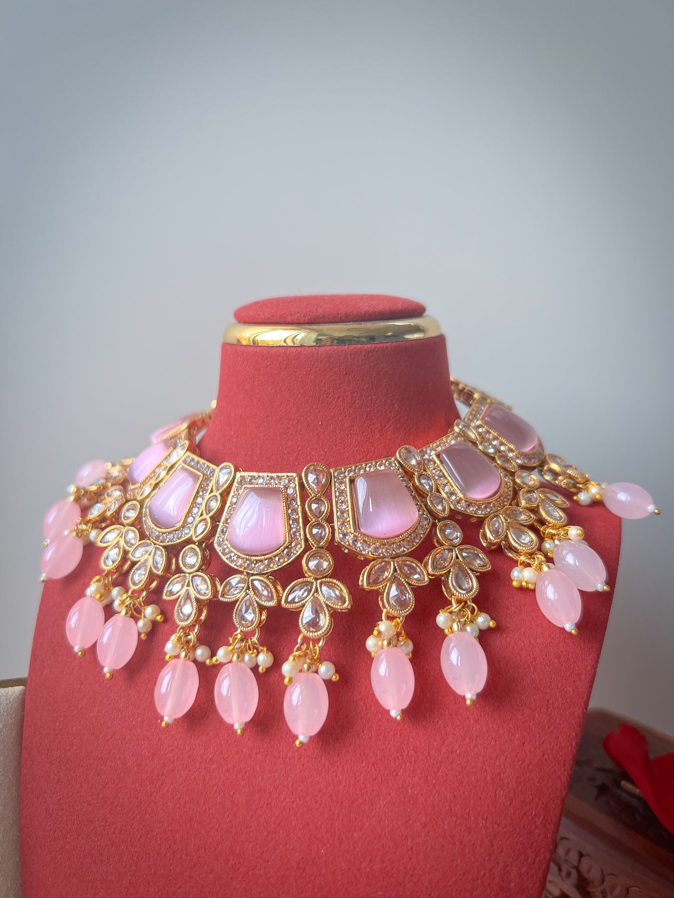 Zorg voor een betoverende finishing touch met deze prachtige goudkleurige Indiase sieradenset met roze stenen en kralen. De set bestaat uit een halsketting met glinsterende stenen en een paar lichte oorbellen. Een mooi ontwerp, gemaakt om op elke gelegenheid mee te schitteren.