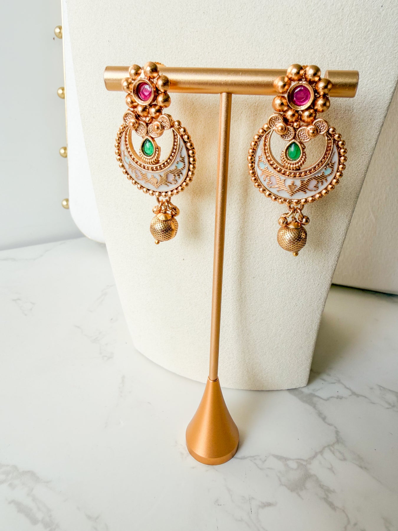 Zorg voor een betoverende finishing touch met deze prachtige goudkleurige Indiase sieradenset. De set bestaat uit een halsketting en een paar oorbellen van 4 cm lang. Een mooi ontwerp, gemaakt om op elke gelegenheid mee te schitteren.