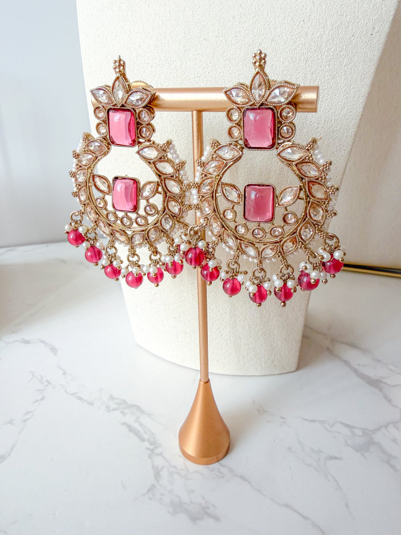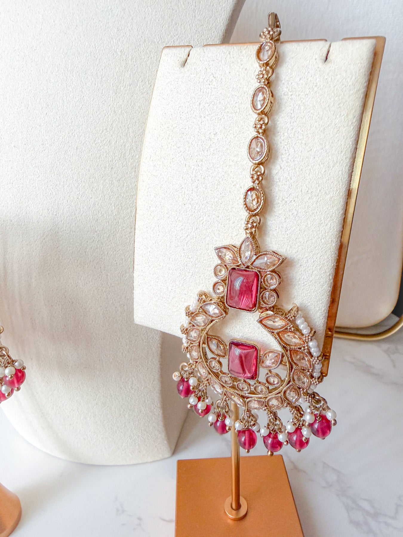 Zorg voor een betoverende finishing touch met deze prachtige goudkleurige Indiase sieradenset, bezet met glinsterende stenen in het fuchsiaroze. De set bestaat uit een choker, een paar chandbali oorbellen en een hoofdisieraad. Een mooi ontwerp, gemaakt om op elke gelegenheid mee te schitteren.