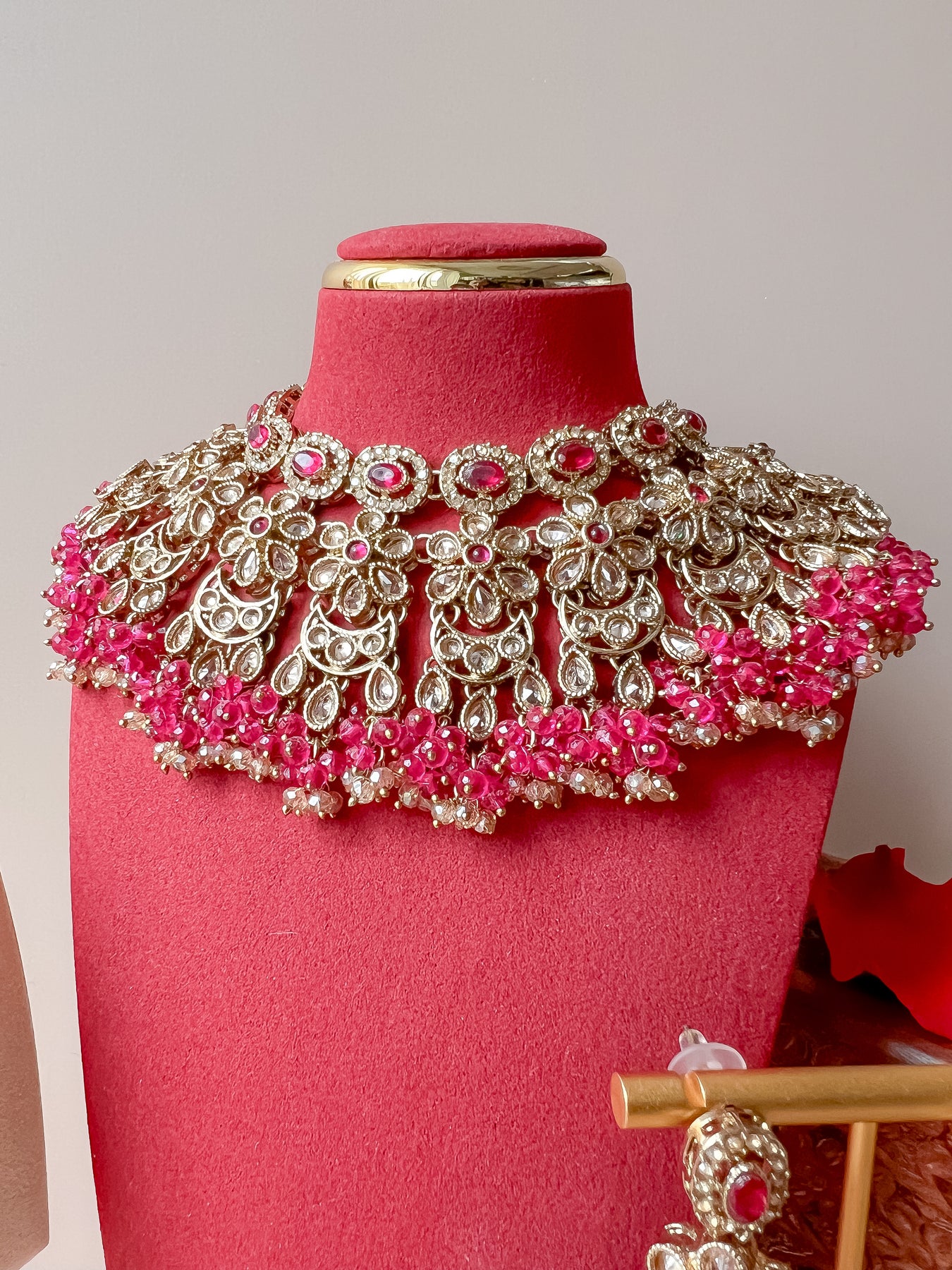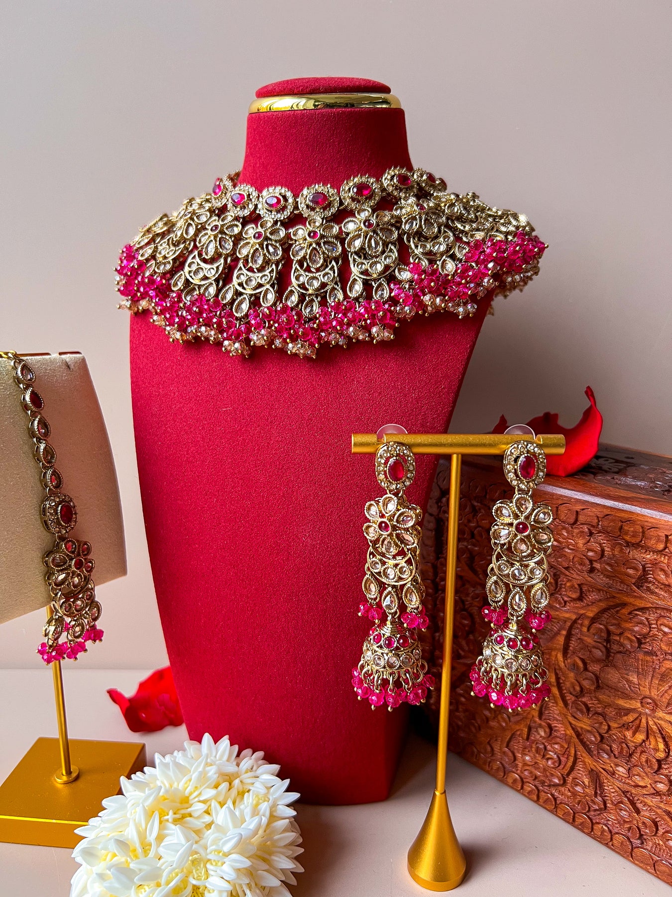 Zorg voor een betoverende finishing touch met deze prachtige antiekgoudkleurige Indiase sieradenset bezet met glinsterende stenen en afgewerkt met donkerroze kralen. De set bestaat uit een halsketting met bloemen, een hoofdsieraad en een paar jhumka oorbellen. Een mooi ontwerp, gemaakt om op elke gelegenheid mee te schitteren.