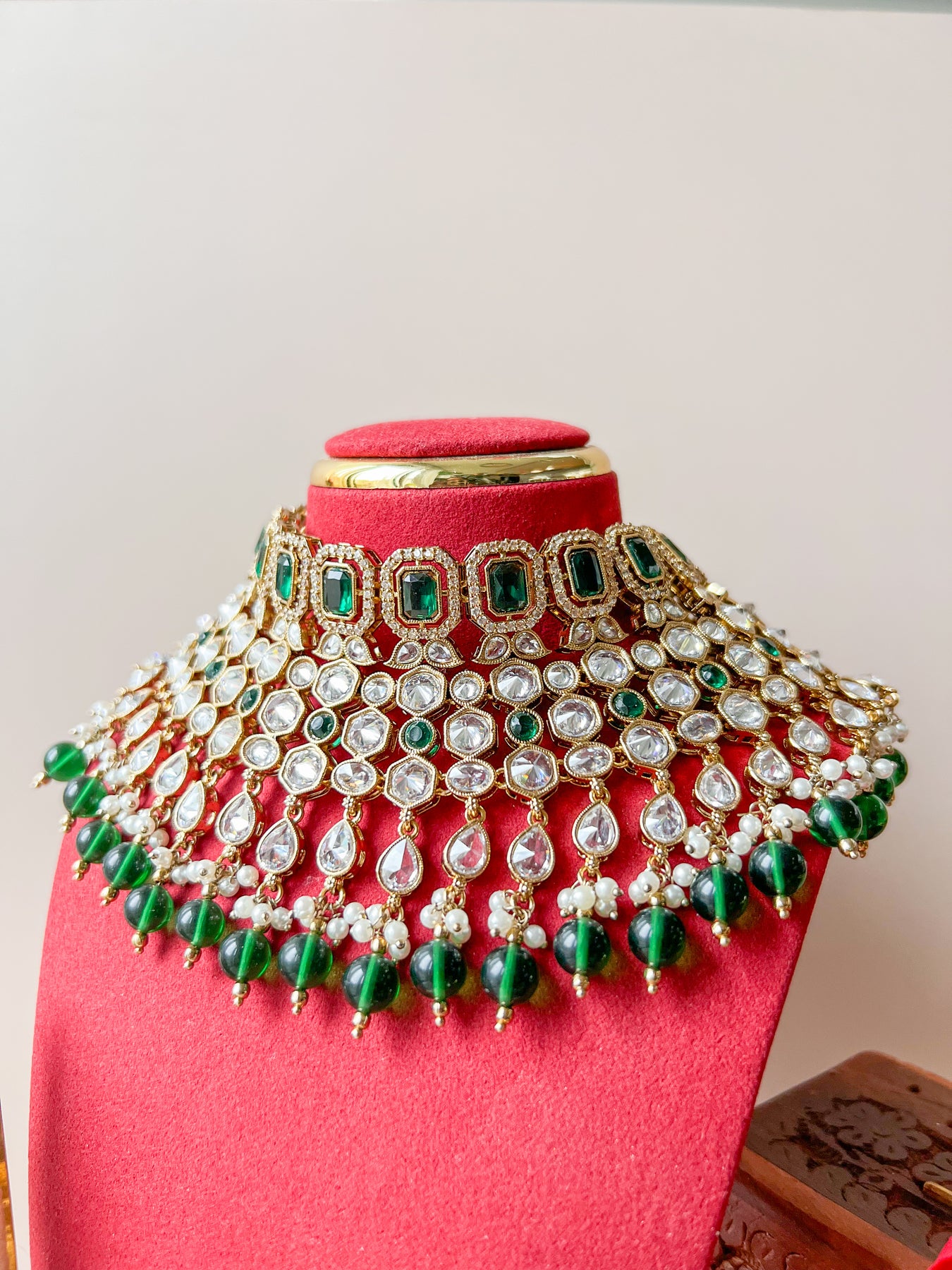 Voeg een vleugje luxe toe aan je stijl met deze prachtige Indiase sieradenset. Een mooi ontwerp, gemaakt om op elke gelegenheid mee te schitteren. De set, bestaande uit een halsketting met glinsterende stenen, is aan de onderzijde afgewerkt met groene kralen. Deze set bestaat ook uit een paar chandbali oorbellen en een hoofdsieraad. Een perfecte set voor jouw bijzondere gelegenheid.