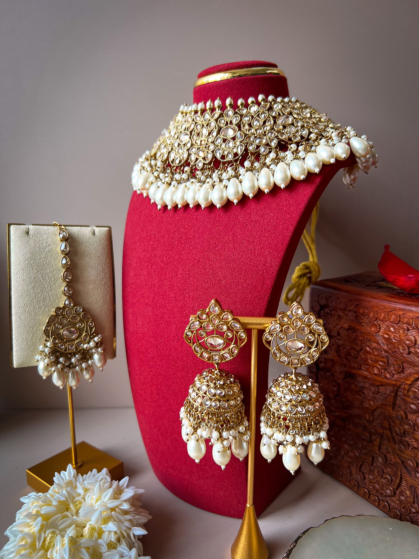 A stunning gold-tone Indian jewellery set studded with glittering stones and consisting of a wide necklace with white beads, a pair of jhumkas and a maang tikka.