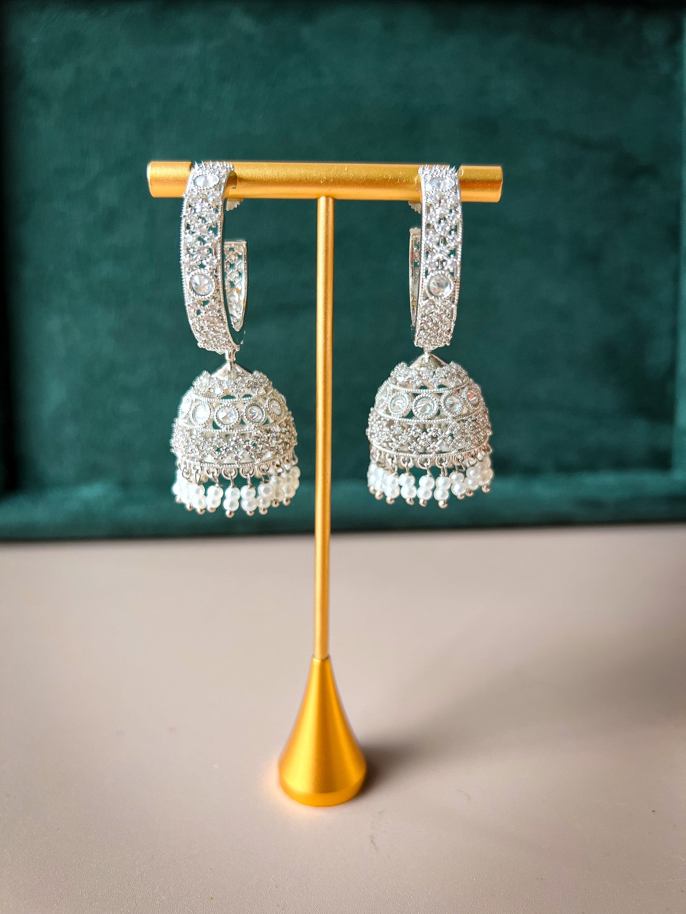 Deze stijlvolle, zilverkleurige jhumka oorbellen zijn bezet met glinsterende stenen en afgewerkt met witte kralen. De oorbellen zijn ongeveer 6 cm lang. Een prachtig paar voor je feestelijke gelegenheid.