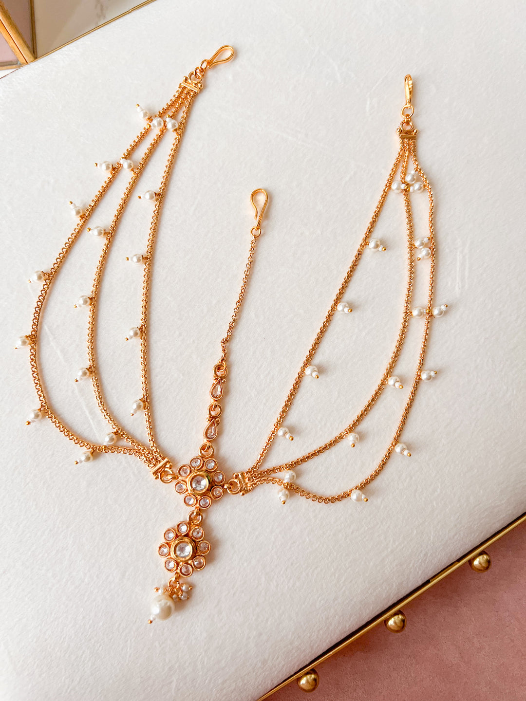 The mathapatti is one of the most iconic and ornate headpieces in Indian culture. This stunning piece is worn like a crown on the head and secured in the hair with hooks. From brides to fashionistas, the mathapatti is a real eye-catcher.