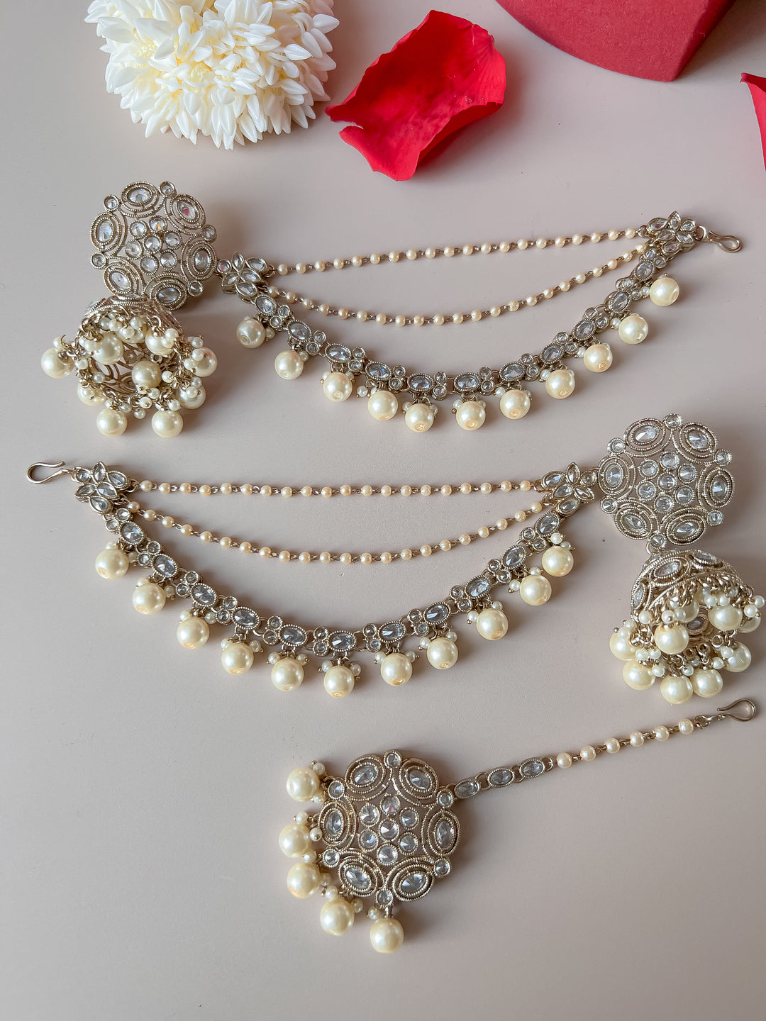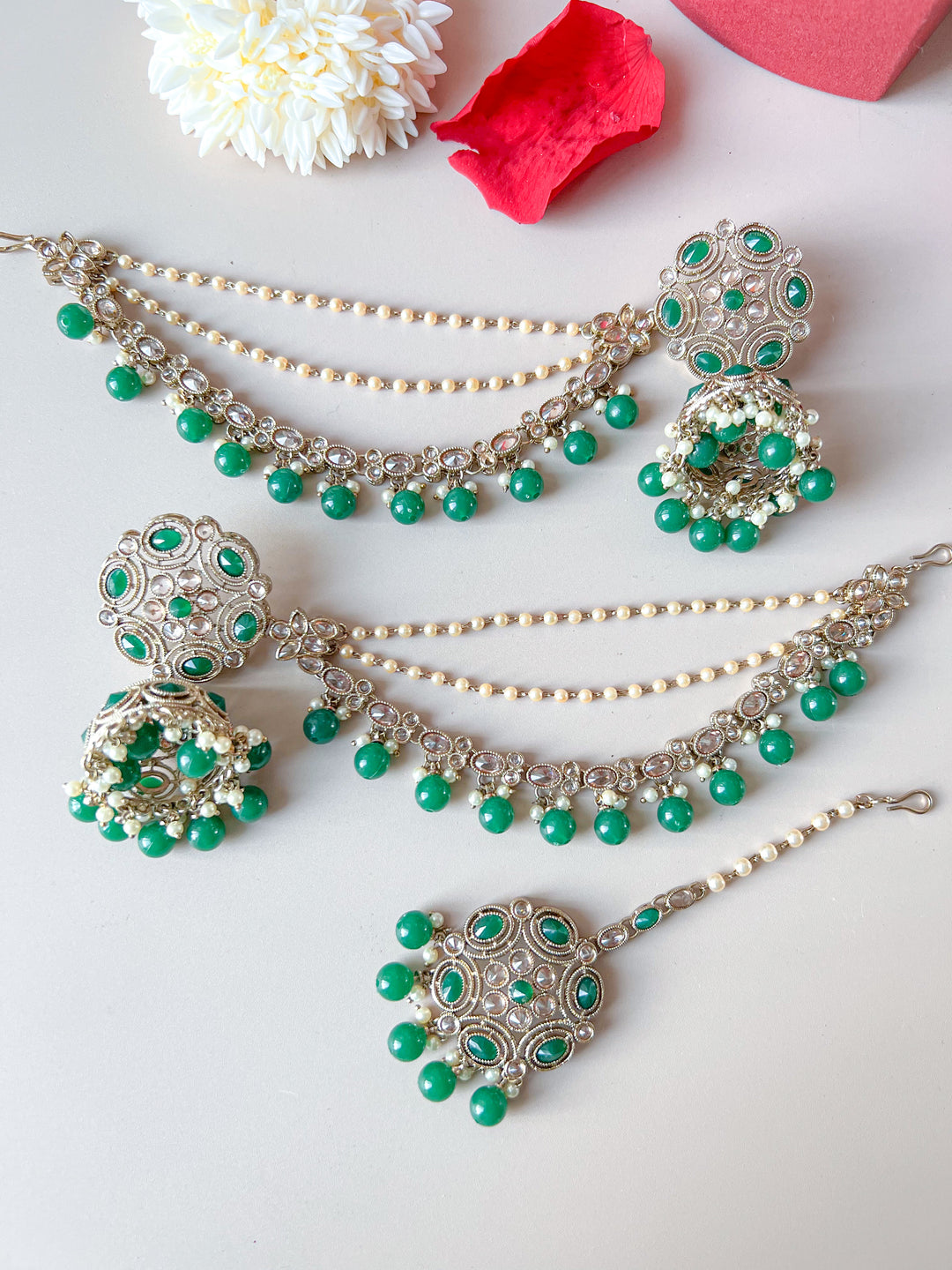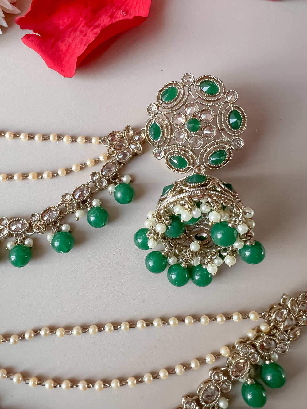 An earring with a hair chain, often an extension of a dangling earring such as a jhumka or chandbali, has a delicate chain that runs up and is fastened in the hair. This adds an extra dimension of glamour and a traditional, beautiful look. The chain can be subtle, with delicate pearls or stones, or lavishly decorated for a grand look.