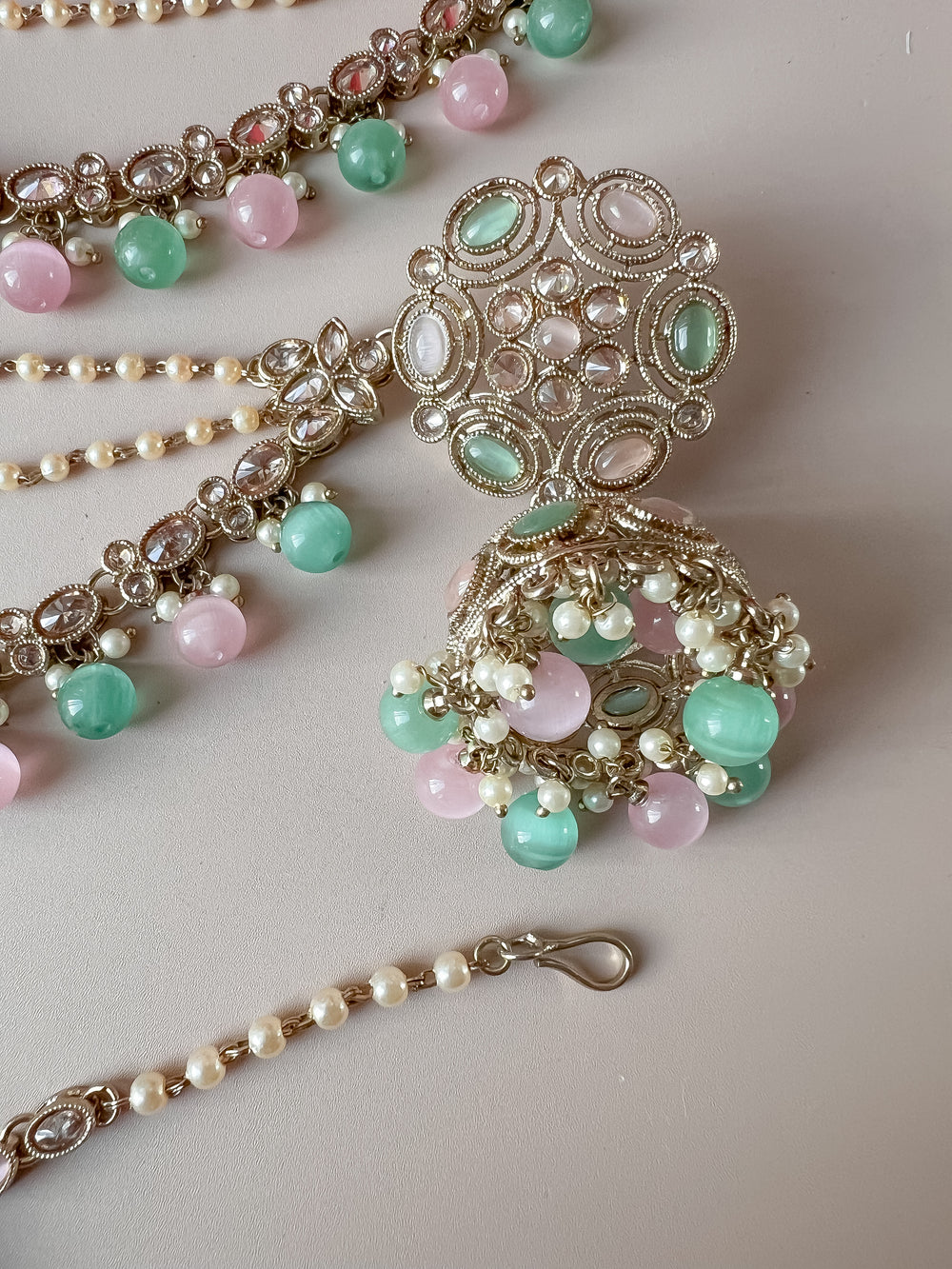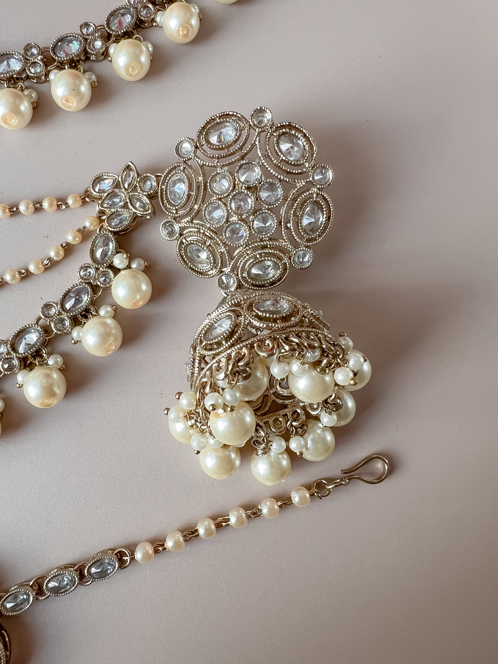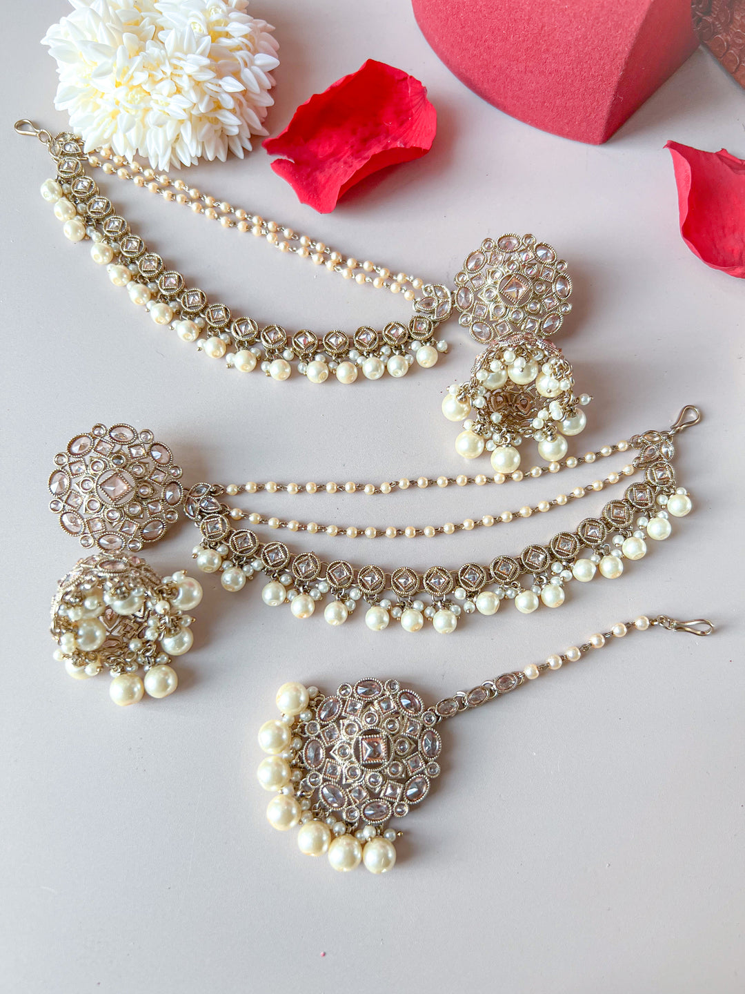An earring with a hair chain, often an extension of a dangling earring such as a jhumka or chandbali, has a delicate chain that runs up and is fastened in the hair. This adds an extra dimension of glamour and a traditional, beautiful look. The chain can be subtle, with delicate pearls or stones, or lavishly decorated for a grand look.