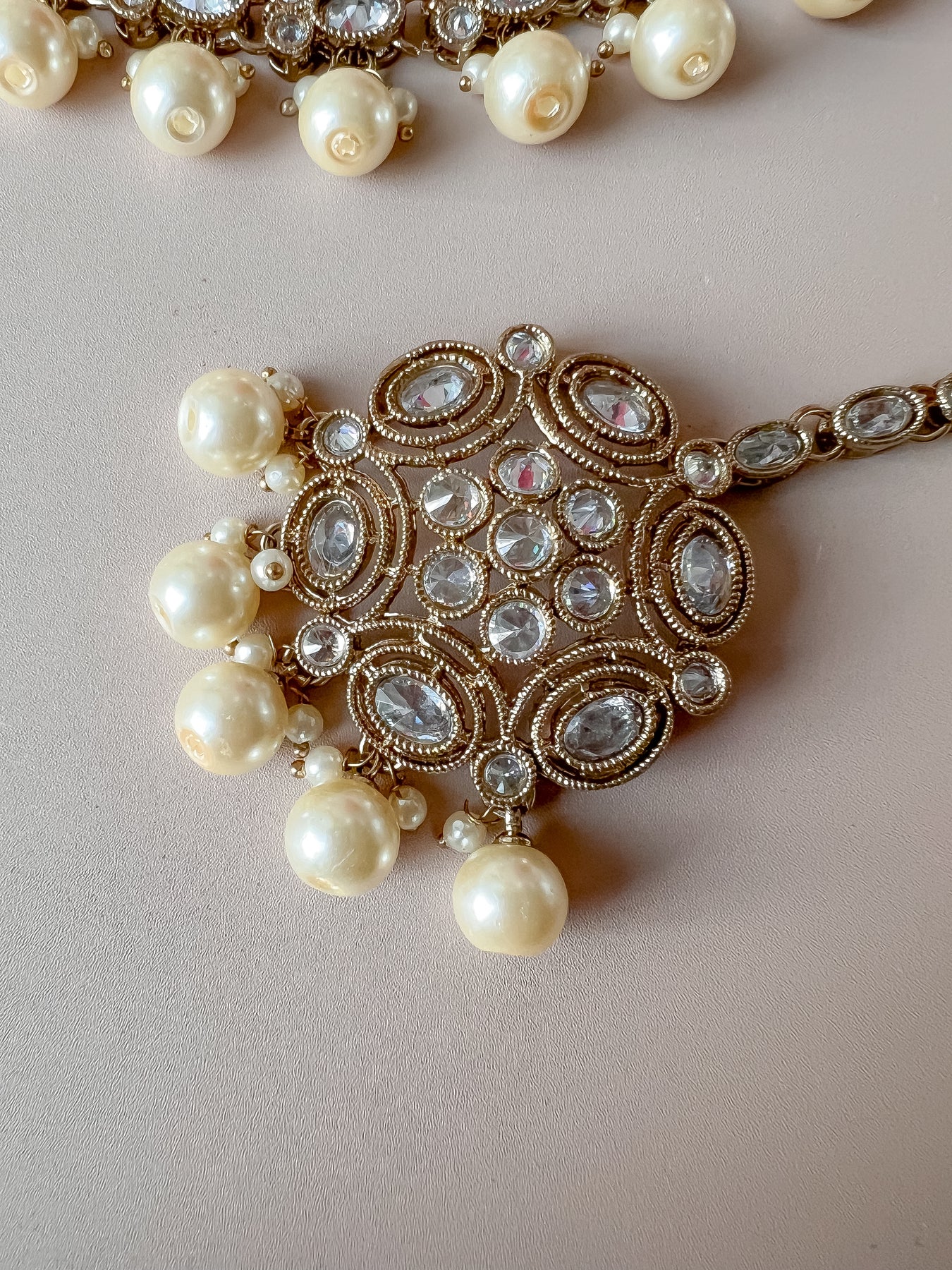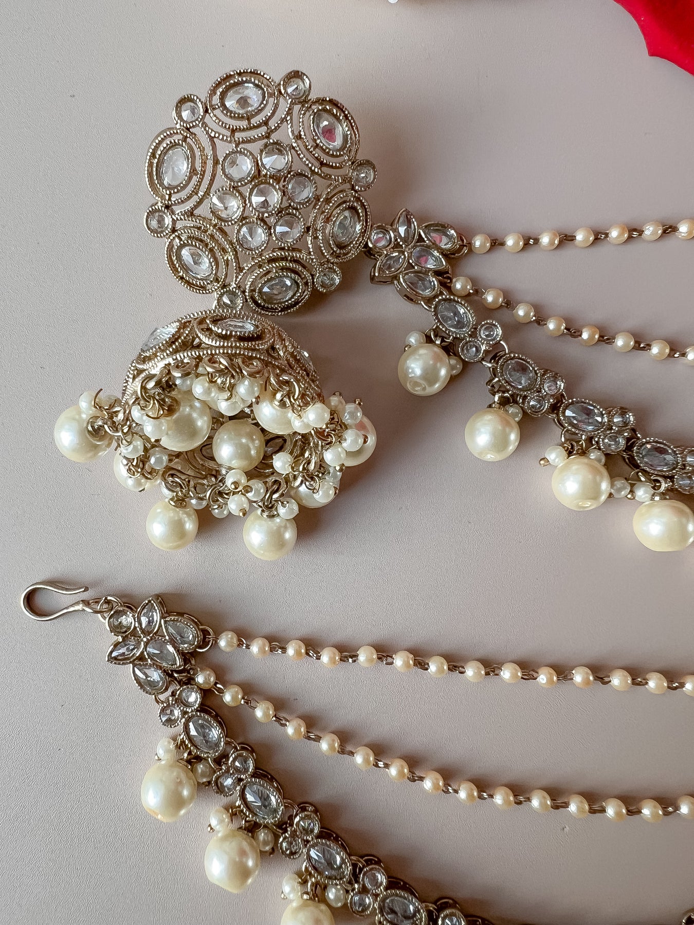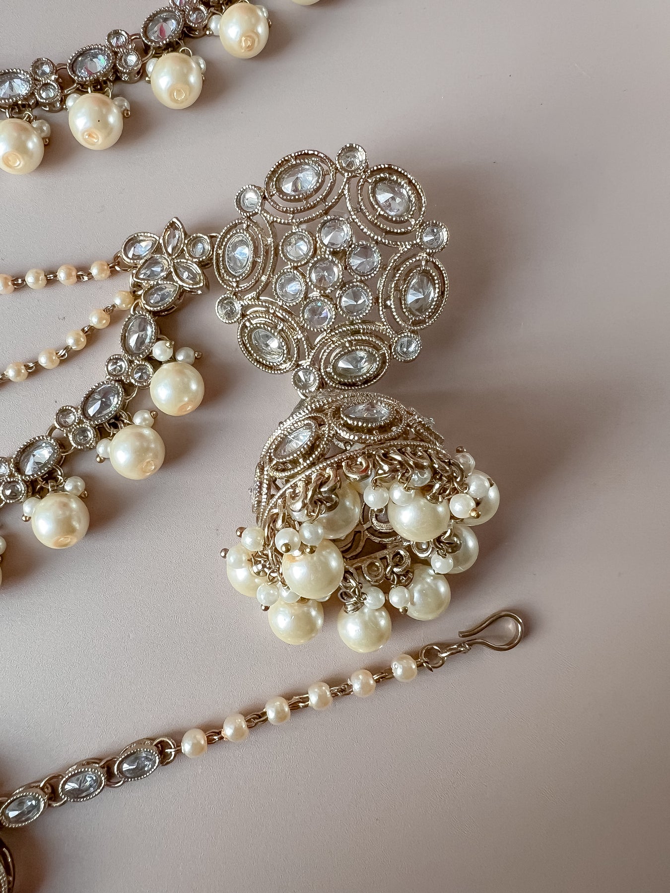 De jhumka oorbellen zijn grote statement oorbellen en hebben een medium gewicht. Met het haakje kun je de kettingen vastzetten in je haren. Een elegant en feestelijk ontwerp, gemaakt om op elke gelegenheid mee te schitteren.