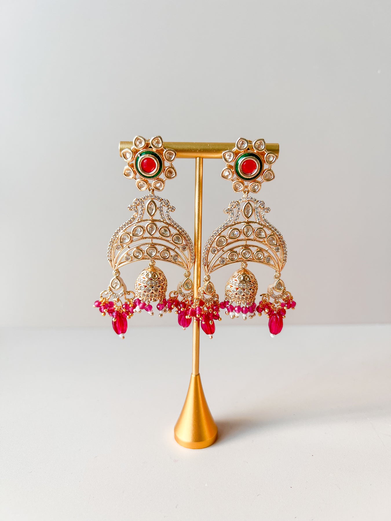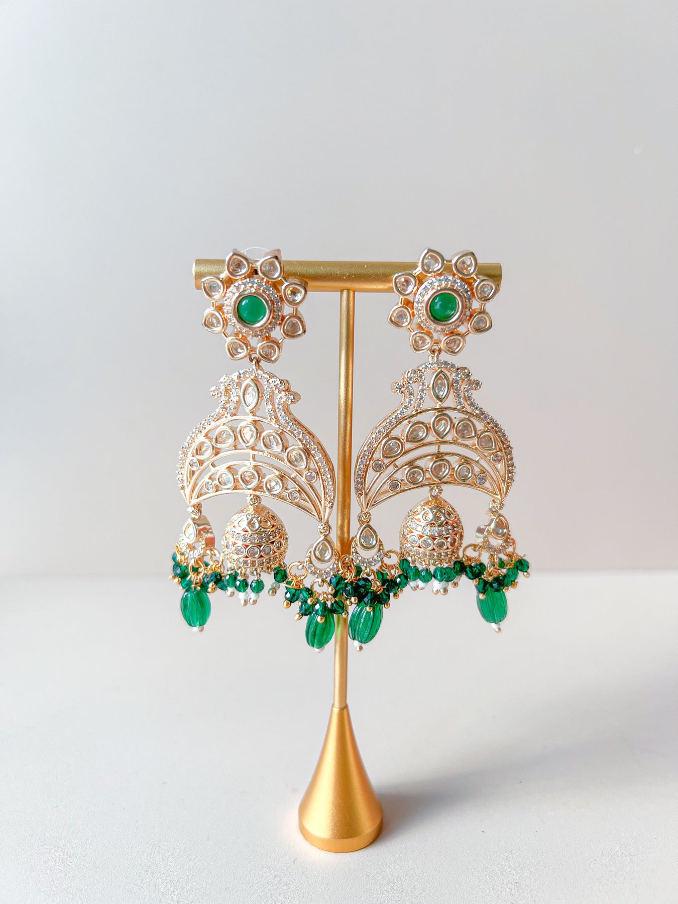 Deze stijlvolle, goudkleurige jhumka oorbellen zijn bezet met glinsterende stenen en zijn verkrijgbaar in drie kleuren, groen, lichtroze en fuchsia. De oorbellen hebben een lengte van 6,5 cm. Een prachtig paar om je look mee compleet te maken.